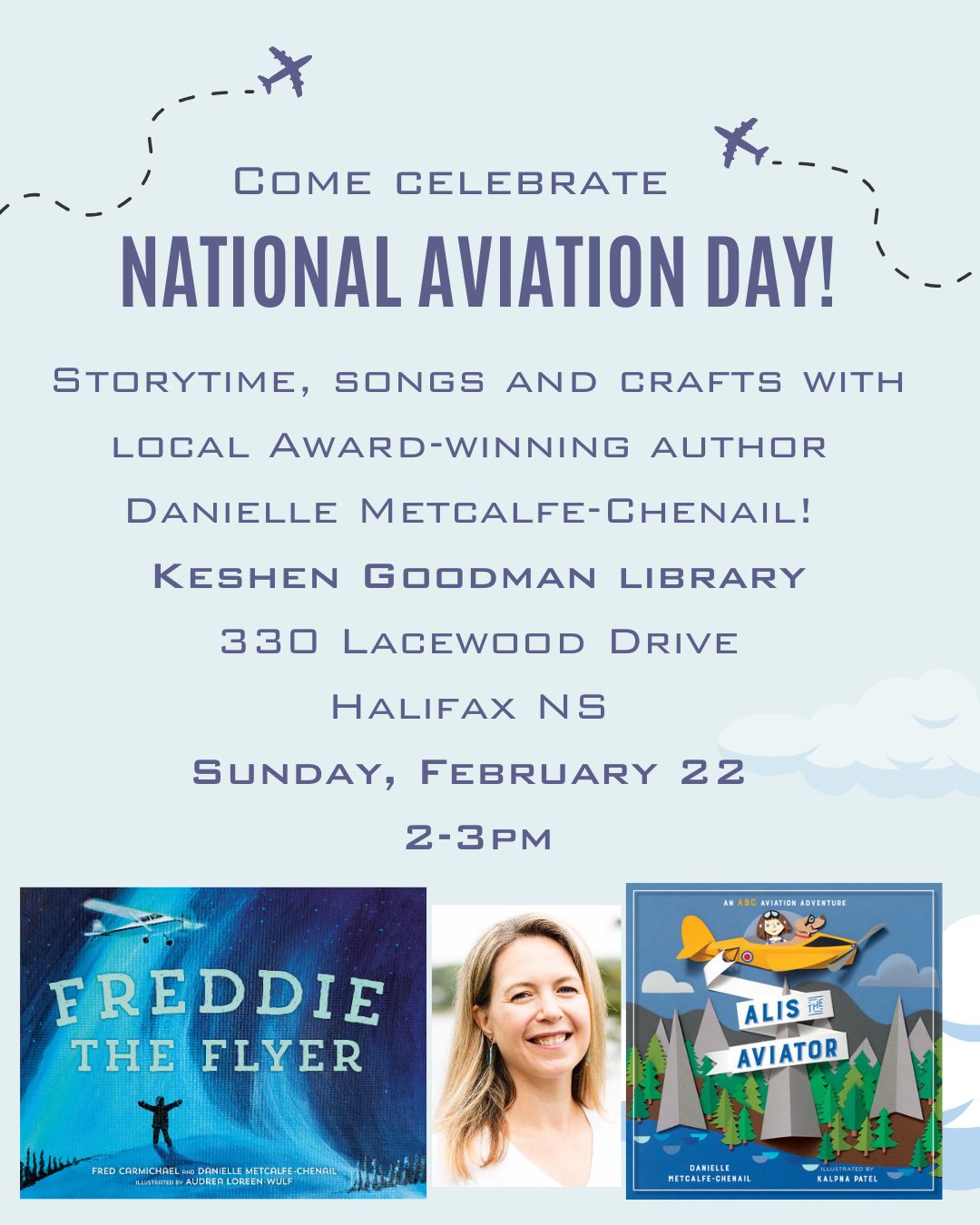 I’ll share my children’s books, Alis the Aviator and Freddie the Flyer, sing some silly songs, and finish with a hands-on craft. Come fly away with us!